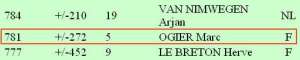 En pleine polémique sur la liste de diffusion, je demande à Emmanuel Lazard de faire entrer Marc 0gier dans le classement officiel de la FFO. Il y arrive avec un ELO d’environ 781 points qui le classe à l’époque parmi les plus faibles joueurs de la planète. Il compte seulement cinq parties jouées, probablement lors d’un quelconque tournoi de province ;-). Sur la liste de diffusion, Stéphane Nicolet, complice, prétend l’avoir effectivement croisé dans une ludothèque à Brétigny.