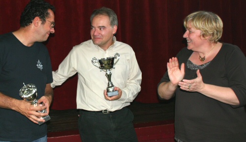 A gauche, Stéphane Nicolet félicite son adversaire, partagé entre la déception de perdre sa deuxième finale en trois ans et le bonheur de voir gagner son ami. A droite, Monique Lecat (présidente de la FFO).