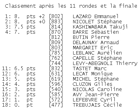 À l’issue des onze rondes du système suisse, Emmanuel Lazard et Stéphane Nicolet se sont qualifiés pour la finale grâce à leurs huit victoires. Champion en titre, Marc nourrissait encore un mince espoir de se qualifier, avant la dernière ronde. Mais en perdant, il s’est trouvé, avec 6,5 points, relégué à la 11e place, derrière un nombre impressionnant de joueurs à sept victoires. C’est dire à quel point cette année le tournoi était serré. Lors de la finale, Emmanuel Lazard n’a pas fait de détail, gagnant 2-0. Exactement 24 ans après son premier titre, submergé par l’émotion, il a pu savourer sa victoire.