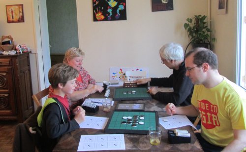 Le samedi 28 avril dernier s’est déroulé un tournoi IDF2, modeste par le nombre de participants mais pas par le niveau des joueurs. Le meilleur d’entre eux, Arnaud Delaunay, est Grand Maître et vice champion de France 2011. Arthur, 10 ans, est pour sa part champion de France junior et 14e du dernier championnat du Monde (Senior). Quant à votre serviteur, il a très fièrement précédé Arnaud au rang de vice champion de France (2010, donc). Ajoutons que Monique a terminé troisième femme au championnat du Monde 2008, et que Céline avait remporté cinq victoires sur 13 parties, au championnat du monde 2007. Autant dire que malgré le côté bon enfant de ce tournoi, qui s’est déroulé au domicile de Céline, il y avait une certaine tension.
