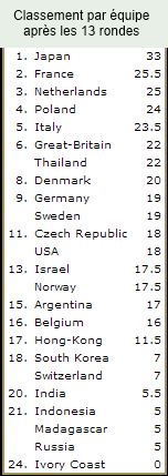 L’équipe de France, composée de Takuji Kashiwabara, Emmanuel Caspard et Arnaud Delaunay, arrive deuxième — première du reste du monde serait-on tenté de dire. Cette place est d’autant plus méritée que les trois joueurs se sont battus jusqu’au bout pour aller la chercher, alors même qu’aucun d’eux ne pouvait plus accéder aux demi-finales et que la France n’était que 4e après la ronde 12. Cette performance a été arrachée au bout d’un suspense incroyable. En individuel, et sans tenir compte du départage, Takuji Kashiwabara termine 5e (avec 9 points sur 13), Emmanuel Caspard 7e (8,5 points) et Arnaud Delaunay 10e (8 points).