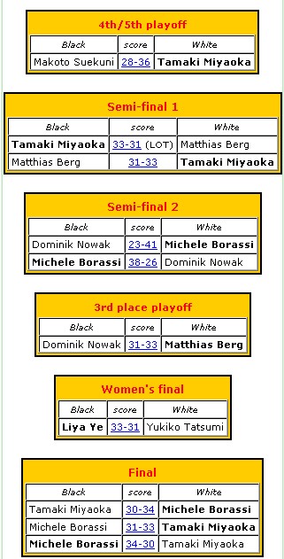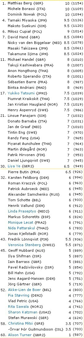 Chez les dames, Liya Ye l’emporte sur le fil en finale contre Yukiko Tatsumi qui avait pourtant nettement dominé le toutes rondes avec 7,5 points (contre 6,5 à son adversaire). Avec 6 points, Monique Lecat (belge mais présidente de la FFO) est 3eme ex-aequo, en compagnie de la néerlandaise Linda Praseptyo et de la Thaïlandaise Noda Pattarakul. Monique a indéniablement hissé son niveau de jeu, parvenant à battre plusieurs adversaires (hommes et femmes) bien mieux classés qu’elle.